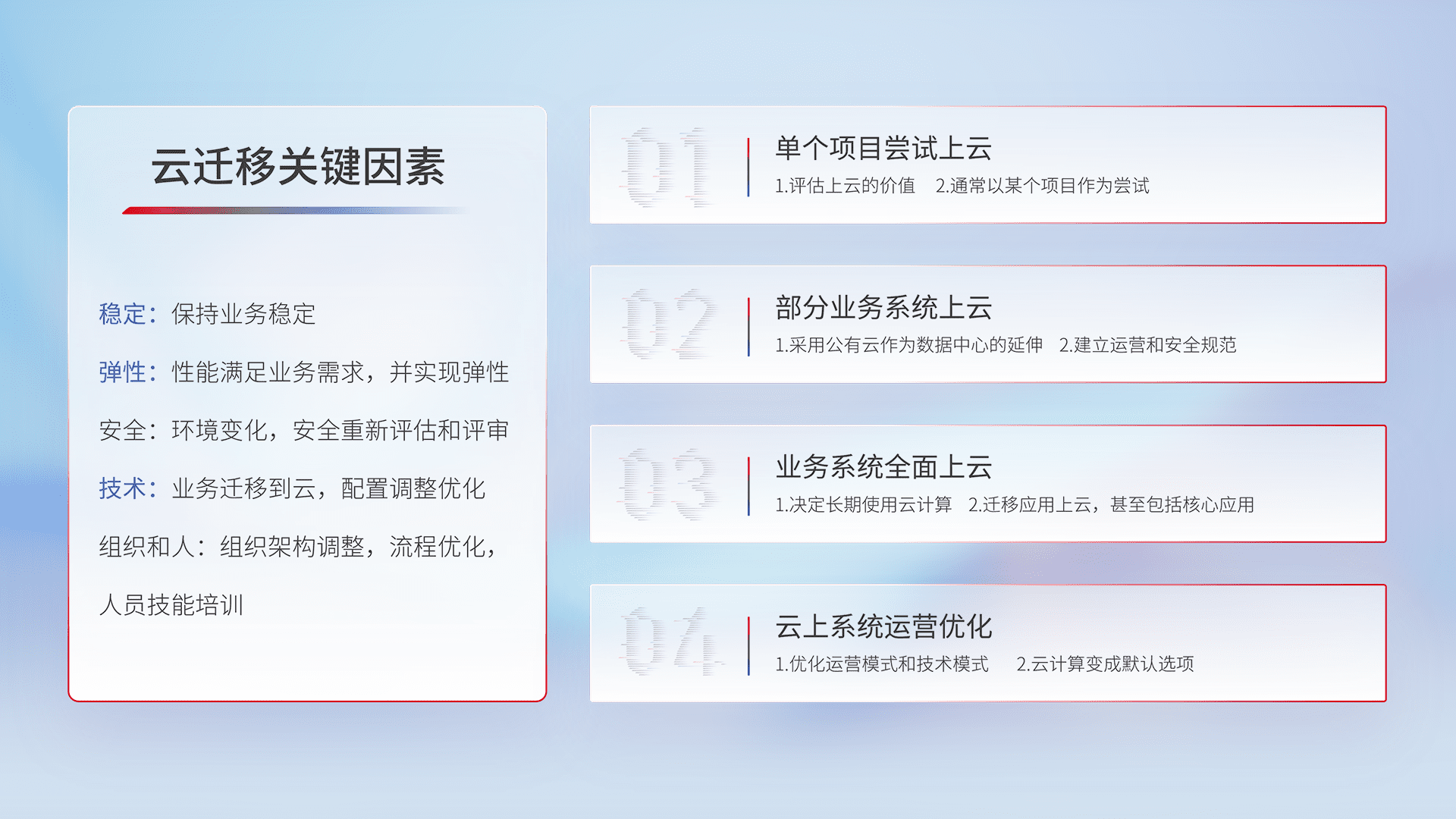 结合实际业务,,,从规划设计、、、、云平台选型、、、、云原生改造、、、数据迁移、、、、集成交付,,迁移全过程为客户识别最佳上云路径,,,做好风险识别管理,,设计网络架构、、、、身份权限、、、安全审计合规、、、操作审计、、、、日志审计、、、监控告警策略、、多站点容灾设计等,,,,对云上基础设施进行整体规划,,,提升IT治理水平,,,,以满足弹性、、高可用、、、、高性能的需求。。。