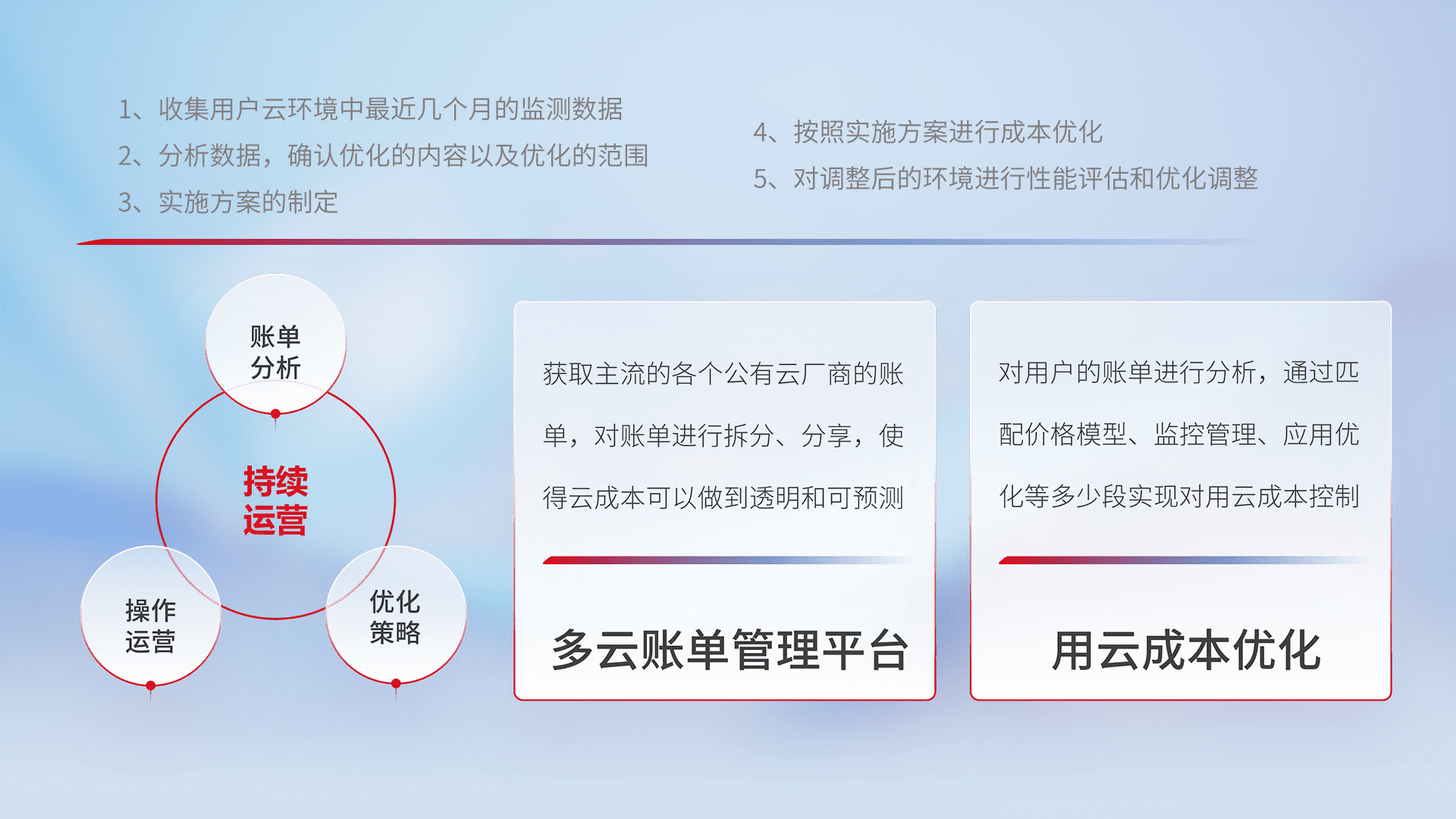 通过多云纳管,,,以统一的资源数据模型把客户的云资源进行抽象和封装,,,进而实现对多云资源的统一操作,,,保障云资源管理的可靠性、、、稳定性与可用性。。量身定制化运维内容,,,配置、、、、开发运维、、、、补丁管理、、、备份、、、、监控、、、、认证和访问管理、、、审计和日常巡检等,,保障在用云过程中的可靠度,,,稳定度以及高可用率。。