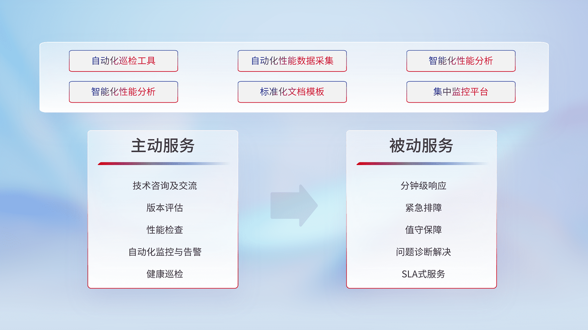 智能化工具和标准化文档,,,保障服务质量,,,提供主动服务(包含技术咨询、、、、版本评估、、、、性能检查、、自动化监控与告警、、、、健康巡检)和被动服务包含(分钟级响应、、、、紧急排障、、、、值守保障、、问题诊断解决、、、SLA服务)。。。。